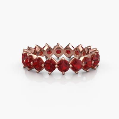 This is our Janie 3.4mm ring. This specific type is called an eternity ring and it is set with a continuous line of identically cut gemstones. The ring is made in 14 Carat rose gold and is set with small ruby, 3.4 mm. The amazing ruby are identical in size and are set in the ring band. Our ruby are selected with great care so they are identical, which gives the best result. In order to get the best result, our artisans position all ruby by hand with the utmost care. Our Goldsmiths have one ambition, which is creating the perfect ring. That is why we love what we do. In the end you get a stunning luxury rose gold stackable ring with a row of ruby which seem to have no beginning nor end. The perfect symbol of your undying love for her! How special is that!After receiving your order, our goldsmiths will passionately start the creative process of making your ring in our own studio. Because we don't have a big stockpile, these costs will not be passed on to you. Our pricing is proof of that! We offer top quality jewels at lowest price, guaranteed.Our talented designers add new designs to our online collection daily. Together they create a diverse collection of the finest jewelry. If you prefer to make a ring according your own design, please feel free to request a quote. We will make you an amazing offer, based on quality and price.To make it easier for you, we offer a 30 day return policy. Check our terms and conditions.
