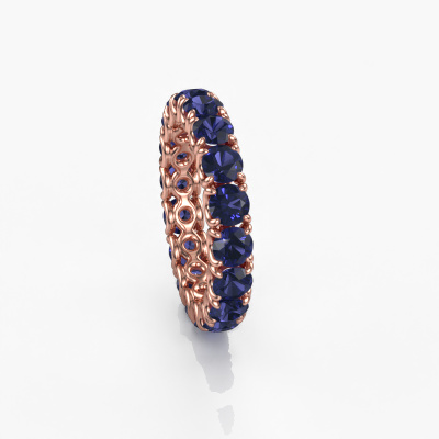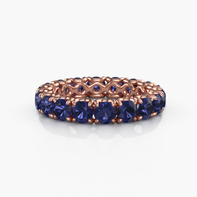 This is our Estee 3.7 ring. This specific type is called an eternity ring and it is set with a continuous line of identically cut gemstones. The ring is made in 14 Carat rose gold and is set with small sapphire, 3.7 mm. The amazing sapphire are identical in size and are set in the ring band. Our sapphire are selected with great care so they are identical, which gives the best result. In order to get the best result, our artisans position all sapphire by hand with the utmost care. Our Goldsmiths have one ambition, which is creating the perfect ring. That is why we love what we do. In the end you get a stunning classic rose gold stackable ring with a row of sapphire which seem to have no beginning nor end. The perfect symbol of your undying love for her! How special is that!After receiving your order, our goldsmiths will passionately start the creative process of making your ring in our own studio. Because we don't have a big stockpile, these costs will not be passed on to you. Our pricing is proof of that! We offer top quality jewels at lowest price, guaranteed.Our talented designers add new designs to our online collection daily. Together they create a diverse collection of the finest jewelry. If you prefer to make a ring according your own design, please feel free to request a quote. We will make you an amazing offer, based on quality and price.To make it easier for you, we offer a 30 day return policy. Check our terms and conditions.