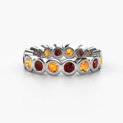 This is our Edwina 3 ring. This specific type is called an eternity ring and it is set with a continuous line of identically cut gemstones. The ring is made in 14 Carat white gold and is set with small garnet, 3 mm. The amazing garnet are identical in size and are set in the ring band. Our garnet are selected with great care so they are identical, which gives the best result. In order to get the best result, our artisans position all garnet by hand with the utmost care. Our Goldsmiths have one ambition, which is creating the perfect ring. That is why we love what we do. In the end you get a stunning trendy white gold stackable ring with a row of garnet which seem to have no beginning nor end. The perfect symbol of your undying love for her! How special is that!After receiving your order, our goldsmiths will passionately start the creative process of making your ring in our own studio. Because we don't have a big stockpile, these costs will not be passed on to you. Our pricing is proof of that! We offer top quality jewels at lowest price, guaranteed.Our team of talented, passionate designers add new ring designs to our online collection daily. Our objective in doing so, is to be able to offer you a wide variety of jewels. Please feel free to request a quote if you have specific wishes for your ring. We guarantee to make you an offer you can't refuse.To make it easier for you, we offer a 30 day return policy. Check our terms and conditions.