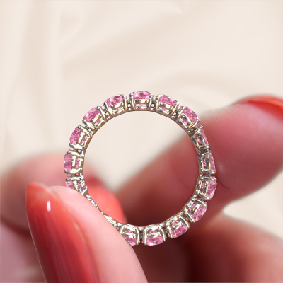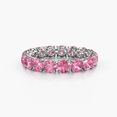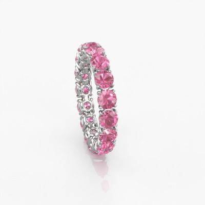 This is our Vivienne 3.7 ring. This specific type is called an eternity ring and it is set with a continuous line of identically cut gemstones. The ring is made in 14 Carat white gold and is set with small pink sapphire, 3.7 mm. The amazing pink sapphire are identical in size and are set in the ring band. Our pink sapphire are selected with great care so they are identical, which gives the best result. In order to get the best result, our artisans position all pink sapphire by hand with the utmost care. Our Goldsmiths have one ambition, which is creating the perfect ring. That is why we love what we do. In the end you get a stunning classic white gold stackable ring with a row of pink sapphire which seem to have no beginning nor end. The perfect symbol of your undying love for her! How special is that!After receiving your order, our goldsmiths will start the creative process of making your Vivienne 3.7 ring. We don't keep stock. This is advantageous because these costs will not be passed on to you. Therefore, we can offer jewelry at exceptionally low prices.New jewelry designs are added to our online collection daily. Our team of passionate designers strive to create extraordinary and diverse designs. Have you seen a ring you like? Please feel free to contact us. Based on a good price/ quality ratio, we will make you an offer you can't refuse!To make it easier for you, we offer a 30 day return policy. Check our terms and conditions.