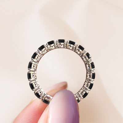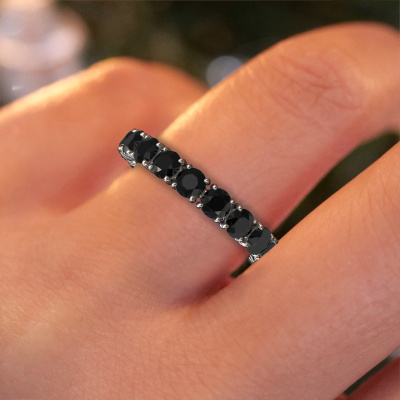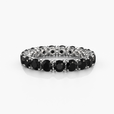 This is our Vivienne 3.4 ring. This specific type is called an eternity ring and it is set with a continuous line of identically cut gemstones. The ring is made in 14 Carat white gold and is set with small black diamonds, 3.240 crt. The amazing black diamonds are identical in size and are set in the ring band. Our black diamonds are selected with great care so they are identical, which gives the best result. In order to get the best result, our artisans position all black diamonds by hand with the utmost care. Our Goldsmiths have one ambition, which is creating the perfect ring. That is why we love what we do. In the end you get a stunning classic white gold stackable ring with a row of black diamonds which seem to have no beginning nor end. The perfect symbol of your undying love for her! How special is that!Are you on a budget? Please feel free to contact us, so we can go discuss your options. We offer our rings at guaranteed best price, because we make them to order. You won't find such a price anywhere else!Our team of talented, passionate designers add new ring designs to our online collection daily. Our objective in doing so, is to be able to offer you a wide variety of jewels. Please feel free to request a quote if you have specific wishes for your ring. We guarantee to make you an offer you can't refuse.To make it easier for you, we offer a 30 day return policy. Check our terms and conditions.