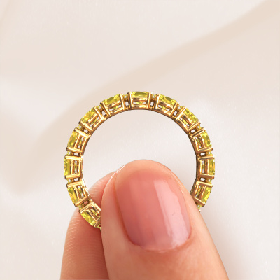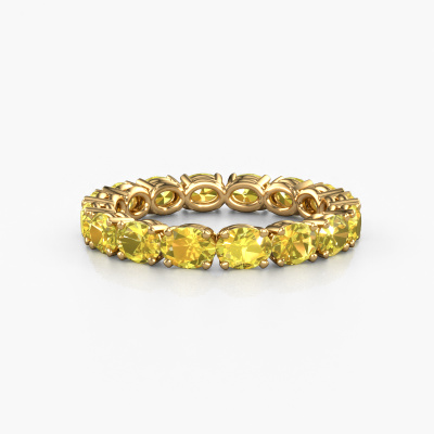 This is our Vivienne OVL 4x3 ring. This specific type is called an eternity ring and it is set with a continuous line of identically cut gemstones. The ring is made in 14 Carat gold and is set with small yellow sapphire, 4x3 mm. This gold Eternity ring is a perfectly beautiful and meaningful way to give your proposal that special touch. The magnificent evenly shaped yellow sapphire are pave set around the ring. The identical yellow sapphire are carefully selected to give the ring a maximum effect. Do keep in mind we use natural resources so small differences between stones are common. The special effect is enhanced due to precise positioning of the yellow sapphire. This requires the utmost precision and a skillful hand but for our skilled artisans this is what excites them. The result is a ring with a row of yellow sapphire which seem to have no beginning nor end. The perfect symbol of your love for her! Isn't she a beauty?Because we design and deliver our own rings, we can offer you a ring at a price you won't find anywhere else. A ring is made to order, which helps prevent excess supplies, so we can make you a great price offer. We understand it feels risky, buying your ring online, but we will gladly assist in the designing process, taking your budget into consideration.Our team of talented, passionate designers add new ring designs to our online collection daily. Our objective in doing so, is to be able to offer you a wide variety of jewels. Please feel free to request a quote if you have specific wishes for your ring. We guarantee to make you an offer you can't refuse.To make it easier for you, we offer a 30 day return policy. Check our terms and conditions.