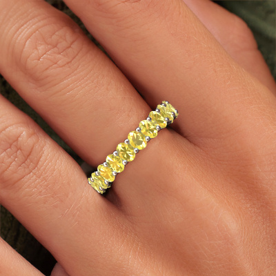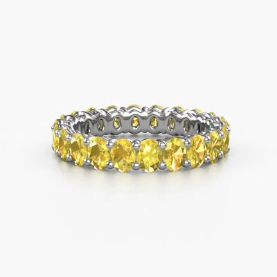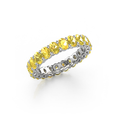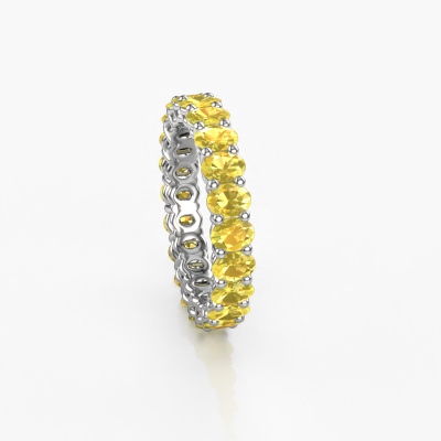 This is our Heddy OVL 3x4 ring. This specific type is called an eternity ring and it is set with a continuous line of identically cut gemstones. The ring is made in 14 Carat white gold and is set with small yellow sapphire, 4x3 mm. This white gold Eternity ring is a perfectly beautiful and meaningful way to give your proposal that special touch. The magnificent evenly shaped yellow sapphire are pave set around the ring. The identical yellow sapphire are carefully selected to give the ring a maximum effect. Do keep in mind we use natural resources so small differences between stones are common. The special effect is enhanced due to precise positioning of the yellow sapphire. This requires the utmost precision and a skillful hand but for our skilled artisans this is what excites them. The result is a stackable ring with a row of yellow sapphire which seem to have no beginning nor end. The perfect symbol of your love for her! Isn't she a beauty?After receiving your order, our goldsmiths will start the creative process of making your Heddy OVL 3x4 ring. We don't keep stock. This is advantageous because these costs will not be passed on to you. Therefore, we can offer jewelry at exceptionally low prices.
