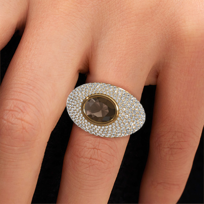 Are you looking for a pavé set ring with an eye-catching single gemstone? How do you like this Armida ring? This gold Armida ring is set with a beautiful 9x7 mm oval smokey quartz. The smokey quartz is carefully selected by our smokey quartz suppliers. Subsequently, these gemstones are then set by our goldsmith according to ancient tradition. The ring will then be polished to perfection creating a unique ring with a stunning smokey quartz. Created especially for you. How do you like this exclusive gold ring? Simply customize this Armida ring, using our online tool. Subsequently, your personal pavé set Armida ring will be made by hand by our goldsmiths. Precious metals and gemstones can be customized to your liking. Do you have specific preferences which are unavailable in our online tool? Please feel free to contact us. We will customize your personal exclusive ring to your liking.Because we design and deliver our own rings, we can offer you a ring at a price you won't find anywhere else. A ring is made to order, which helps prevent excess supplies, so we can make you a great price offer. We understand it feels risky, buying your ring online, but we will gladly assist in the designing process, taking your budget into consideration.To make it easier for you, we offer a 30 day return policy. Check our terms and conditions.