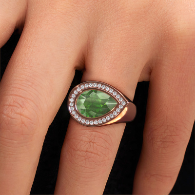 Are you looking for a special ring with an eye-catching single gemstone? How do you like this Latashia ring? This rose gold Latashia ring is set with a beautiful 12x8 mm pear tourmaline green. The tourmaline green is carefully selected by our tourmaline green suppliers. Subsequently, these gemstones are then set by our goldsmith according to ancient tradition. The ring will then be polished to perfection creating a unique ring with a stunning tourmaline green. Created especially for you. Customize your own specialLatashia ring, which will then be created by our goldsmiths with great passion. Do you prefer a different option than is shown here in the rose gold Latashia ring? Then our online tools offers various options. Feel free to ask us for help if you are unable to succeed. We are happy to answer your questions!By using a combination of the latest modern techniques, combined with ancient crafting, we can make all our rings in our own studio. Each jewel is made to order. This is advantageous because we can offer you a price you won't find anywhere else.To make it easier for you, we offer a 30 day return policy. Check our terms and conditions.