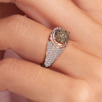 This exclusive rose gold Sharee ring is a true work of art! This ring is made of 14 Carat rose gold and is set with 1.831 crt round brown diamond. The smallest ornaments are crafted by our goldsmith with a lot of patience and great passion. In order to create this ring with great precision, this craft requires a keen eye and a skillful hand. A challenge which ignites a fire in our expert goldsmiths. The exquisite brown diamonds are set in a way that their unique qualities are strengthened. This gives the ring an even more glamorous appearance. The ring is unique by itself though, because of the natural birthstones we selected especially for this Sharee ring. And by choosing the precious metal yourself, you create a unique ring. The special sharee ring, as shown here, can be customized to your liking. Our online tool offers many different options but please feel free to contact us if you want changes made to your sharee ring, which are unavailable in our online tool.Because we design and deliver our own rings, we can offer you a ring at a price you won't find anywhere else. A ring is made to order, which helps prevent excess supplies, so we can make you a great price offer. We understand it feels risky, buying your ring online, but we will gladly assist in the designing process, taking your budget into consideration.To make it easier for you, we offer a 30 day return policy. Check our terms and conditions.