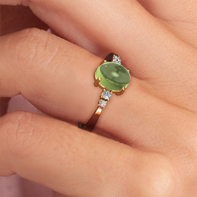 In this photo the rose gold Jelke ring is set with a cabochon peridot. Cabochon means a peridot is shaped first, not faceted, into a specific shape, such as a drop, heart or oval cabochon. Subsequently, it is polished until the gemstone has a orb shaped surface. A cabochon gemstone is a stunning, classy eye-catcher that matches perfectly with a contemporary as well as a vintage style. Our expert goldsmiths shape the daring ring to perfection which makes it unique. The cabochon peridot is set so its unique qualities are strengthened. Customize your own daringJelke ring, which will then be created by our goldsmiths with great passion. Do you prefer a different option than is shown here in the rose gold Jelke ring? Then our online tools offers various options. Feel free to ask us for help if you are unable to succeed. We are happy to answer your questions!By using our modern techniques, we can design and customize the finest quality jewels with the utmost care for you. Our rings are always priced 30 percent lower than other jewelers. We make rings to order, so we don't have to maintain a large stock. If you have a certain budget, we are more than happy to advice you accordingly.To make it easier for you, we offer a 30 day return policy. Check our terms and conditions.