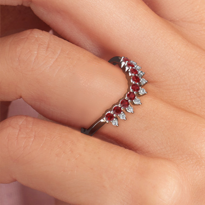 This Vivian B stackable ring in 14 Carat white gold is set with ruby. This white gold stacked Vivian B ring is the perfect addition to your ring collection! As the name suggests, it is a ring which can be combined on one finger with another ring. It gives you the opportunity to create your own style. A stacked ring usually represents a certain memory of someone special or a memorable moment. It is common to combine a stacked ring, representing an anniversary, with a wedding ring. But this fashionable ring, combined with your other rings, also makes a classy fashion item. Customize your own fashionableVivian B stackable ring, which will then be created by our goldsmiths with great passion. Do you prefer a different option than is shown here in the white gold Vivian B stackable ring? Then our online tools offers various options. Feel free to ask us for help if you are unable to succeed. We are happy to answer your questions!After receiving your order, our goldsmiths will start the creative process of making your Vivian B ring. We don't keep stock. This is advantageous because these costs will not be passed on to you. Therefore, we can offer jewelry at exceptionally low prices.To make it easier for you, we offer a 30 day return policy. Check our terms and conditions.