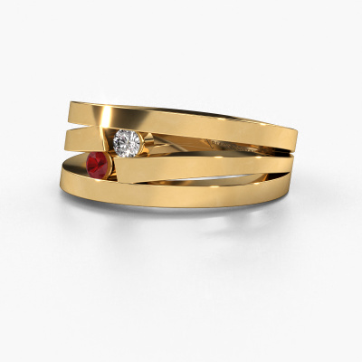 This ring is called Valerie. It is made of 14 Carat gold and is set with 2.7 mm ruby. Are you looking for a unique gold ring with a modern appearance? Then this is the ring for you. Simply customize to your or her liking. Perfect for a modern, contemporary woman! This 2 stones ring is adorned with stunning ruby. It was carefully selected because your ring must be adorned with nothing but the most beautiful gemstones. Our expert goldsmith will create your ring in our own studio, where the ruby will be set with great care. The ring will then be polished to perfection to create a beautiful ring. By using a combination of the latest modern techniques, combined with ancient crafting, we can make all our rings in our own studio. Each jewel is made to order. This is advantageous because we can offer you a price you won't find anywhere else.New jewelry designs are added to our online collection daily. Our team of passionate designers strive to create extraordinary and diverse designs. Have you seen a ring you like? Please feel free to contact us. Based on a good price/ quality ratio, we will make you an offer you can't refuse!To make it easier for you, we offer a 30 day return policy. Check our terms and conditions.