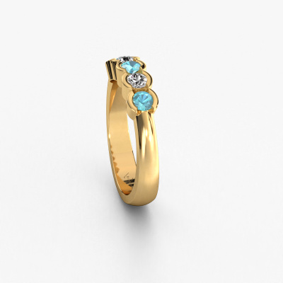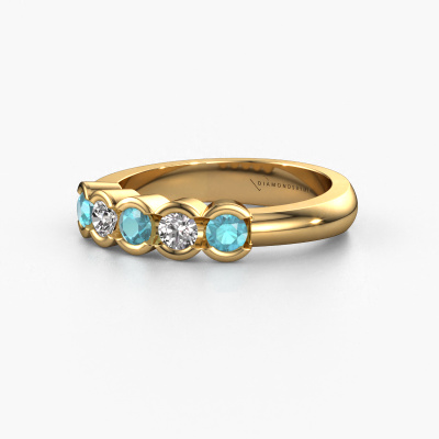 This ring is called Lotte 5. It is made of 14 Carat gold and is set with 3 mm blue topaz. Are you looking for a unique gold ring with a modern appearance? Then this is the ring for you. Simply customize to your or her liking. Perfect for a modern, contemporary woman! This 5 stones ring is adorned with stunning blue topaz. It was carefully selected because your ring must be adorned with nothing but the most beautiful gemstones. Our expert goldsmith will create your ring in our own studio, where the blue topaz will be set with great care. The ring will then be polished to perfection to create a beautiful ring. By using a combination of the latest modern techniques, combined with ancient crafting, we can make all our rings in our own studio. Each jewel is made to order. This is advantageous because we can offer you a price you won't find anywhere else.Our team of talented, passionate designers add new ring designs to our online collection daily. Our objective in doing so, is to be able to offer you a wide variety of jewels. Please feel free to request a quote if you have specific wishes for your ring. We guarantee to make you an offer you can't refuse.To make it easier for you, we offer a 30 day return policy. Check our terms and conditions.