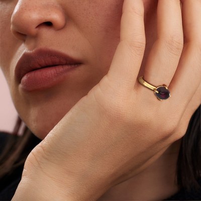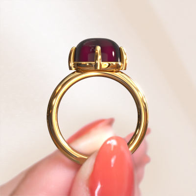 In this photo the gold Melodee ring is set with a cabochon garnet. Cabochon means a garnet is shaped first, not faceted, into a specific shape, such as a drop, heart or oval cabochon. Subsequently, it is polished until the gemstone has a orb shaped surface. A cabochon gemstone is a stunning, classy eye-catcher that matches perfectly with a contemporary as well as a vintage style. Our expert goldsmiths shape the charming ring to perfection which makes it unique. The cabochon garnet is set so its unique qualities are strengthened. Our goldsmiths passionately create your customized ring to your liking with the utmost care. The gold ring, as shown here, can be customized using our online tool. Feel free to ask our jewel designers for assistance if you want changes made which are unavailable in our online tool. We are happy to answer your questions.After receiving your order, our goldsmiths will passionately start the creative process of making your ring in our own studio. Because we don't have a big stockpile, these costs will not be passed on to you. Our pricing is proof of that! We offer top quality jewels at lowest price, guaranteed.To make it easier for you, we offer a 30 day return policy. Check our terms and conditions.