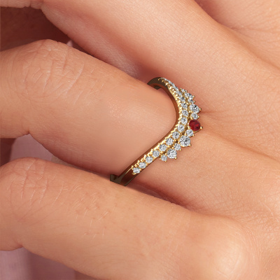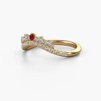 This Nica B stackable ring in 14 Carat gold is set with ruby. This gold stacked Nica B ring is the perfect addition to your ring collection! As the name suggests, it is a ring which can be combined on one finger with another ring. It gives you the opportunity to create your own style. A stacked ring usually represents a certain memory of someone special or a memorable moment. It is common to combine a stacked ring, representing an anniversary, with a wedding ring. But this fashionable ring, combined with your other rings, also makes a classy fashion item. The fashionable Nica B stackable ring, as shown here, can be customized to your liking. Our online tool offers many different options but please feel free to contact us if you want changes made to your Nica B stackable ring, which are unavailable in our online tool.By using our modern techniques, we can design and customize the finest quality jewels with the utmost care for you. Our rings are always priced 30 percent lower than other jewelers. We make rings to order, so we don't have to maintain a large stock. If you have a certain budget, we are more than happy to advice you accordingly.To make it easier for you, we offer a 30 day return policy. Check our terms and conditions.