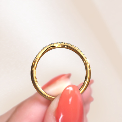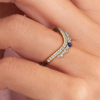 This Nica B stackable ring in 14 Carat gold is set with sapphire. This gold stacked Nica B ring is the perfect addition to your ring collection! As the name suggests, it is a ring which can be combined on one finger with another ring. It gives you the opportunity to create your own style. A stacked ring usually represents a certain memory of someone special or a memorable moment. It is common to combine a stacked ring, representing an anniversary, with a wedding ring. But this fashionable ring, combined with your other rings, also makes a classy fashion item. The fashionable Nica B stackable ring, as shown here, can be customized to your liking. Our online tool offers many different options but please feel free to contact us if you want changes made to your Nica B stackable ring, which are unavailable in our online tool.By using our modern techniques, we can design and customize the finest quality jewels with the utmost care for you. Our rings are always priced 30 percent lower than other jewelers. We make rings to order, so we don't have to maintain a large stock. If you have a certain budget, we are more than happy to advice you accordingly.To make it easier for you, we offer a 30 day return policy. Check our terms and conditions.