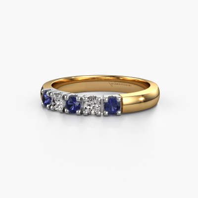 This extraordinary ring is called Rianne 5. This type of ring is known as a memoire ring, because its gemstones are set in a continuous line. This makes it easy to combine with other rings. The band of this 14 Carat gold ring is set in a combination of sapphire and diamond 2.7 mm. You can easily choose the combination you prefer online. As you can see, a single sapphire is set in this single alliance gold ring. The memoire ring represents collaboration. And that is precisely what these gemstones do, collaborate. Together they add a beautiful effect to the band of a classic ring! Such a meaningful ring, wouldn't you agree? All of our hand selected sapphire are positioned by hand by our expert goldsmith. It's a precise task, which can only be completed successfully through the combination of pure craftsmanship and usage of the latest techniques which give it an optimal effect. To create a perfect reflection of light, all the gemstones have to be perfectly aligned in the same way. During manufacturing, the expert goldsmith will therefore monitor the reflection of light constantly to check whether the sapphire are aligned properly. This requires a skilled hand and a lot of patience but then the end product will be a true piece of art. And that is our mission!By using a combination of the latest modern techniques, combined with ancient crafting, we can make all our rings in our own studio. Each jewel is made to order. This is advantageous because we can offer you a price you won't find anywhere else.