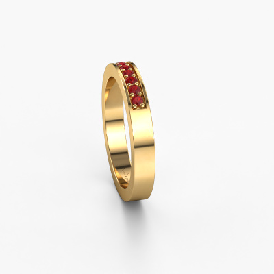 This ring called Loes 5 is made of 14 Carat gold and is set with ruby. Are you in the market for a unique gold stackable ring with a modern twist? Then this ring might suit you. Simply customize to your or her liking. It suits the contemporary modern woman. This half eternity stackable ring is set with beautiful ruby. This has been carefully selected. Because your stackable ring must be adorned with nothing but the most stunning gemstone. Our expert goldsmith will create your ring in our own studio, where the ruby will be set with great care. The ring will then be polished to perfection to create a stunning ring. After receiving your order, our goldsmiths will start the creative process of making your Loes 5 ring. We don't keep stock. This is advantageous because these costs will not be passed on to you. Therefore, we can offer jewelry at exceptionally low prices.Our talented designers add new designs to our online collection daily. Together they create a diverse collection of the finest jewelry. If you prefer to make a ring according your own design, please feel free to request a quote. We will make you an amazing offer, based on quality and price.To make it easier for you, we offer a 30 day return policy. Check our terms and conditions.