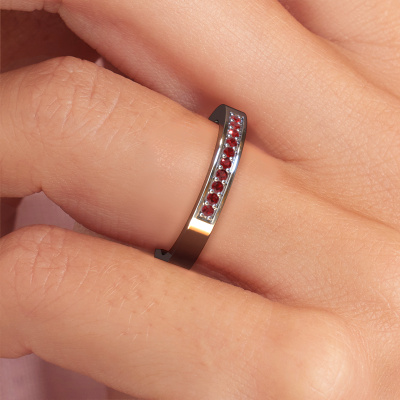 This Loes 3 stackable ring in platinum is set with ruby. This platinum stacked Loes 3 ring is the perfect addition to your ring collection! As the name suggests, it is a ring which can be combined on one finger with another ring. It gives you the opportunity to create your own style. A stacked ring usually represents a certain memory of someone special or a memorable moment. It is common to combine a stacked ring, representing an anniversary, with a wedding ring. But this half eternity ring, combined with your other rings, also makes a classy fashion item. The best part of this half eternity stackable ring is that you can customize it to your own liking. Your style, your choice, your stackable ring. On top of that, your modern platinum stackable ring will be made by hand with eco-friendly materials! Please feel free to easily customize the ring, using our online tool.After receiving your order, our goldsmiths will start the creative process of making your Loes 3 ring. We don't keep stock. This is advantageous because these costs will not be passed on to you. Therefore, we can offer jewelry at exceptionally low prices.To make it easier for you, we offer a 30 day return policy. Check our terms and conditions.