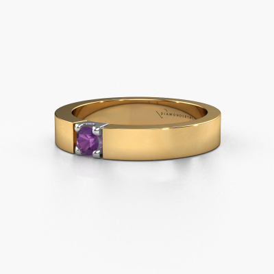 This extraordinary ring is called Dana 1. This type of ring is known as a memoire ring, because it's birthstones are set in a continuous line. This makes it easy to combine with other rings. The band of this 14 Carat gold ring is set in a combination of amethyst and amethyst 3.7 mm. You can easily choose the combination you prefer online. As you can see, a single amethyst is set in this single alliance gold ring. The memoire ring represents collaboration. And that is precisely what these gemstones do, collaborate. Together they add a beautiful effect to the band of a modern ring! Such a meaningful ring, wouldn't you agree? All of our hand selected amethysten are positioned by hand by our expert goldsmith. It's a precise task, which can only be completed successfully through the combination of pure craftsmanship and usage of the latest techniques which give it an optimal effect. To create a perfect reflection of light, all the gemstones have to be perfectly aligned in the same way. During manufacturing, the expert goldsmith will therefore monitor the reflection of light constantly to check whether the amethysten are aligned properly. This requires a skilled hand and a lot of patience but then the end product will be a true piece of art. And that is our mission!After receiving your order, our goldsmiths will passionately start the creative process of making your ring in our own studio. Because we don't have a big stockpile, these costs will not be passed on to you. Our pricing is proof of that! We offer top quality jewels at lowest price, guaranteed.Our team of talented, passionate designers add new ring designs to our online collection daily. Our objective in doing so, is to be able to offer you a wide variety of jewels. Please feel free to request a quote if you have specific wishes for your ring. We guarantee to make you an offer you can't refuse.To make it easier for you, we offer a 30 day return policy. Check our terms and conditions.