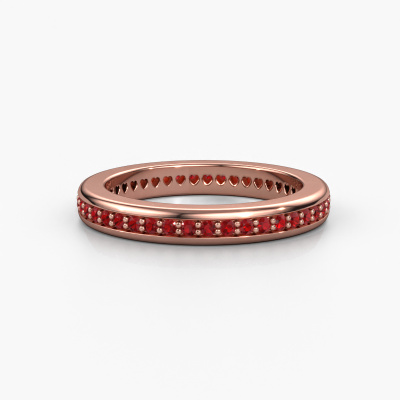 This extraordinary ring is called Elvire 3. This type of ring is known as a memoire ring, because it's birthstones are set in a continuous line. This makes it easy to combine with other rings. The band of this 14 Carat rose gold stackable ring is set in a combination of ruby and ruby 1.3 mm. You can easily choose the combination you prefer online. As you can see, a single ruby is set in this single alliance rose gold stackable ring. The memoire ring represents collaboration. And that is precisely what these gemstones do, collaborate. Together they add a beautiful effect to the band of a modern stackable ring! Such a meaningful ring, wouldn't you agree? All of our hand selected ruby are positioned by hand by our expert goldsmith. It's a precise task, which can only be completed successfully through the combination of pure craftsmanship and usage of the latest techniques which give it an optimal effect. To create a perfect reflection of light, all the gemstones have to be perfectly aligned in the same way. During manufacturing, the expert goldsmith will therefore monitor the reflection of light constantly to check whether the ruby are aligned properly. This requires a skilled hand and a lot of patience but then the end product will be a true piece of art. And that is our mission!By using a combination of the latest modern techniques, combined with ancient crafting, we can make all our rings in our own studio. Each jewel is made to order. This is advantageous because we can offer you a price you won't find anywhere else.Our team of talented, passionate designers add new ring designs to our online collection daily. Our objective in doing so, is to be able to offer you a wide variety of jewels. Please feel free to request a quote if you have specific wishes for your ring. We guarantee to make you an offer you can't refuse.To make it easier for you, we offer a 30 day return policy. Check our terms and conditions.