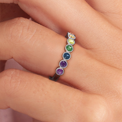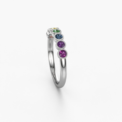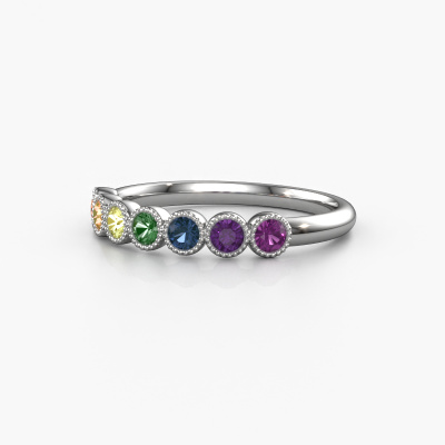 This extraordinary ring is called Mariam half. This type of ring is known as a memoire ring, because it's birthstones are set in a continuous line. This makes it easy to combine with other rings. The band of this 14 Carat white gold ring is set in a combination of Rainbow sapphire 1 and Rainbow sapphire 1 2.4 mm. You can easily choose the combination you prefer online. As you can see, a single Rainbow sapphire 1 is set in this single alliance white gold ring. The memoire ring represents collaboration. And that is precisely what these gemstones do, collaborate. Together they add a beautiful effect to the band of a fantasy ring! Such a meaningful ring, wouldn't you agree? All of our hand selected Rainbow sapphire 1 are positioned by hand by our expert goldsmith. It's a precise task, which can only be completed successfully through the combination of pure craftsmanship and usage of the latest techniques which give it an optimal effect. To create a perfect reflection of light, all the gemstones have to be perfectly aligned in the same way. During manufacturing, the expert goldsmith will therefore monitor the reflection of light constantly to check whether the Rainbow sapphire 1 are aligned properly. This requires a skilled hand and a lot of patience but then the end product will be a true piece of art. And that is our mission!Are you on a budget? Please feel free to contact us, so we can go discuss your options. We offer our rings at guaranteed best price, because we make them to order. You won't find such a price anywhere else!
