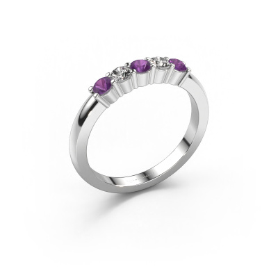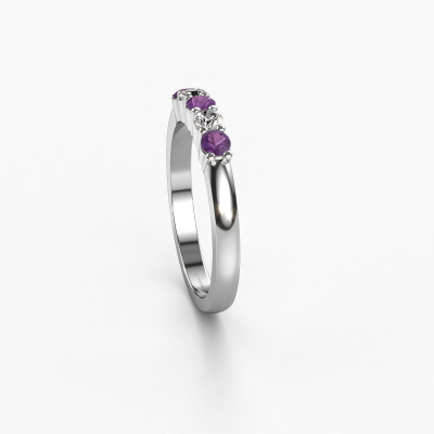 This extraordinary ring is called Yasmin 5. This type of ring is known as a memoire ring, because its gemstones are set in a continuous line. This makes it easy to combine with other rings. The band of this platinum ring is set in a combination of amethyst and diamond 3 mm. You can easily choose the combination you prefer online. As you can see, a single amethyst is set in this single alliance platinum ring. The memoire ring represents collaboration. And that is precisely what these gemstones do, collaborate. Together they add a beautiful effect to the band of a classic ring! Such a meaningful ring, wouldn't you agree? All of our hand selected amethysten are positioned by hand by our expert goldsmith. It's a precise task, which can only be completed successfully through the combination of pure craftsmanship and usage of the latest techniques which give it an optimal effect. To create a perfect reflection of light, all the gemstones have to be perfectly aligned in the same way. During manufacturing, the expert goldsmith will therefore monitor the reflection of light constantly to check whether the amethysten are aligned properly. This requires a skilled hand and a lot of patience but then the end product will be a true piece of art. And that is our mission!After receiving your order, our goldsmiths will passionately start the creative process of making your ring in our own studio. Because we don't have a big stockpile, these costs will not be passed on to you. Our pricing is proof of that! We offer top quality jewels at lowest price, guaranteed.Our talented designers add new designs to our online collection daily. Together they create a diverse collection of the finest jewelry. If you prefer to make a ring according your own design, please feel free to request a quote. We will make you an amazing offer, based on quality and price.To make it easier for you, we offer a 30 day return policy. Check our terms and conditions.
