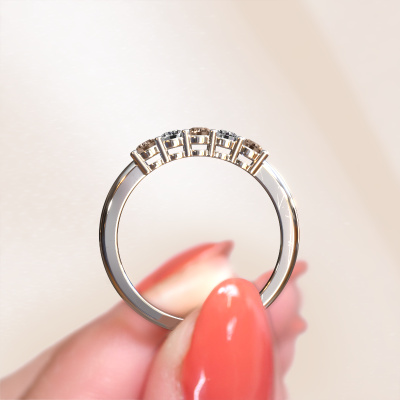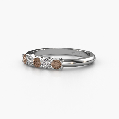 This extraordinary ring is called Michelle 5. This type of ring is known as a memoire ring, because its gemstones are set in a continuous line. This makes it easy to combine with other rings. The band of this platinum ring is set in a combination of brown diamond and lab-grown diamond 0.50 crt. You can easily choose the combination you prefer online. As you can see, a single brown diamond is set in this single alliance platinum ring. The memoire ring represents collaboration. And that is precisely what these gemstones do, collaborate. Together they add a beautiful effect to the band of a classic ring! Such a meaningful ring, wouldn't you agree? All of our hand selected brown diamonds are positioned by hand by our expert goldsmith. It's a precise task, which can only be completed successfully through the combination of pure craftsmanship and usage of the latest techniques which give it an optimal effect. To create a perfect reflection of light, all the gemstones have to be perfectly aligned in the same way. During manufacturing, the expert goldsmith will therefore monitor the reflection of light constantly to check whether the brown diamonds are aligned properly. This requires a skilled hand and a lot of patience but then the end product will be a true piece of art. And that is our mission!Are you on a budget? Please feel free to contact us, so we can go discuss your options. We offer our rings at guaranteed best price, because we make them to order. You won't find such a price anywhere else!