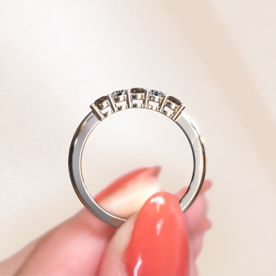 This extraordinary ring is called Michelle 5. This type of ring is known as a memoire ring, because its gemstones are set in a continuous line. This makes it easy to combine with other rings. The band of this platinum ring is set in a combination of smokey quartz and lab-grown diamond 3 mm. You can easily choose the combination you prefer online. As you can see, a single smokey quartz is set in this single alliance platinum ring. The memoire ring represents collaboration. And that is precisely what these gemstones do, collaborate. Together they add a beautiful effect to the band of a classic ring! Such a meaningful ring, wouldn't you agree? All of our hand selected smokey quartz are positioned by hand by our expert goldsmith. It's a precise task, which can only be completed successfully through the combination of pure craftsmanship and usage of the latest techniques which give it an optimal effect. To create a perfect reflection of light, all the gemstones have to be perfectly aligned in the same way. During manufacturing, the expert goldsmith will therefore monitor the reflection of light constantly to check whether the smokey quartz are aligned properly. This requires a skilled hand and a lot of patience but then the end product will be a true piece of art. And that is our mission!Are you on a budget? Please feel free to contact us, so we can go discuss your options. We offer our rings at guaranteed best price, because we make them to order. You won't find such a price anywhere else!