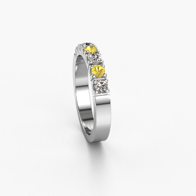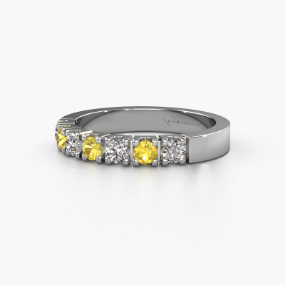 This extraordinary ring is called Dana 7. This type of ring is known as a memoire ring, because its gemstones are set in a continuous line. This makes it easy to combine with other rings. The band of this platinum ring is set in a combination of yellow sapphire and lab-grown diamond 3 mm. You can easily choose the combination you prefer online. As you can see, a single yellow sapphire is set in this single alliance platinum ring. The memoire ring represents collaboration. And that is precisely what these gemstones do, collaborate. Together they add a beautiful effect to the band of a modern ring! Such a meaningful ring, wouldn't you agree? All of our hand selected yellow sapphire are positioned by hand by our expert goldsmith. It's a precise task, which can only be completed successfully through the combination of pure craftsmanship and usage of the latest techniques which give it an optimal effect. To create a perfect reflection of light, all the gemstones have to be perfectly aligned in the same way. During manufacturing, the expert goldsmith will therefore monitor the reflection of light constantly to check whether the yellow sapphire are aligned properly. This requires a skilled hand and a lot of patience but then the end product will be a true piece of art. And that is our mission!After receiving your order, our goldsmiths will passionately start the creative process of making your ring in our own studio. Because we don't have a big stockpile, these costs will not be passed on to you. Our pricing is proof of that! We offer top quality jewels at lowest price, guaranteed.Our team of talented, passionate designers add new ring designs to our online collection daily. Our objective in doing so, is to be able to offer you a wide variety of jewels. Please feel free to request a quote if you have specific wishes for your ring. We guarantee to make you an offer you can't refuse.To make it easier for you, we offer a 30 day return policy. Check our terms and conditions.