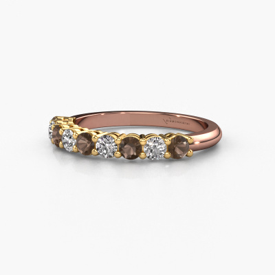This extraordinary ring is called Michelle 9. This type of ring is known as a memoire ring, because its gemstones are set in a continuous line. This makes it easy to combine with other rings. The band of this 14 Carat rose gold ring is set in a combination of smokey quartz and lab-grown diamond 2.7 mm. You can easily choose the combination you prefer online. As you can see, a single smokey quartz is set in this single alliance rose gold ring. The memoire ring represents collaboration. And that is precisely what these gemstones do, collaborate. Together they add a beautiful effect to the band of a classic ring! Such a meaningful ring, wouldn't you agree? All of our hand selected smokey quartz are positioned by hand by our expert goldsmith. It's a precise task, which can only be completed successfully through the combination of pure craftsmanship and usage of the latest techniques which give it an optimal effect. To create a perfect reflection of light, all the gemstones have to be perfectly aligned in the same way. During manufacturing, the expert goldsmith will therefore monitor the reflection of light constantly to check whether the smokey quartz are aligned properly. This requires a skilled hand and a lot of patience but then the end product will be a true piece of art. And that is our mission!Because we design and deliver our own rings, we can offer you a ring at a price you won't find anywhere else. A ring is made to order, which helps prevent excess supplies, so we can make you a great price offer. We understand it feels risky, buying your ring online, but we will gladly assist in the designing process, taking your budget into consideration.Our team of talented, passionate designers add new ring designs to our online collection daily. Our objective in doing so, is to be able to offer you a wide variety of jewels. Please feel free to request a quote if you have specific wishes for your ring. We guarantee to make you an offer you can't refuse.To make it easier for you, we offer a 30 day return policy. Check our terms and conditions.
