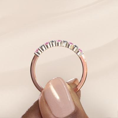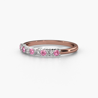 This extraordinary ring is called Yasmin 9. This type of ring is known as a memoire ring, because its gemstones are set in a continuous line. This makes it easy to combine with other rings. The band of this 14 Carat rose gold ring is set in a combination of pink sapphire and diamond 2.4 mm. You can easily choose the combination you prefer online. As you can see, a single pink sapphire is set in this single alliance rose gold ring. The memoire ring represents collaboration. And that is precisely what these gemstones do, collaborate. Together they add a beautiful effect to the band of a classic ring! Such a meaningful ring, wouldn't you agree? All of our hand selected pink sapphire are positioned by hand by our expert goldsmith. It's a precise task, which can only be completed successfully through the combination of pure craftsmanship and usage of the latest techniques which give it an optimal effect. To create a perfect reflection of light, all the gemstones have to be perfectly aligned in the same way. During manufacturing, the expert goldsmith will therefore monitor the reflection of light constantly to check whether the pink sapphire are aligned properly. This requires a skilled hand and a lot of patience but then the end product will be a true piece of art. And that is our mission!By using a combination of the latest modern techniques, combined with ancient crafting, we can make all our rings in our own studio. Each jewel is made to order. This is advantageous because we can offer you a price you won't find anywhere else.Our team of talented, passionate designers add new ring designs to our online collection daily. Our objective in doing so, is to be able to offer you a wide variety of jewels. Please feel free to request a quote if you have specific wishes for your ring. We guarantee to make you an offer you can't refuse.To make it easier for you, we offer a 30 day return policy. Check our terms and conditions.