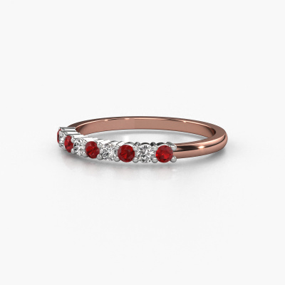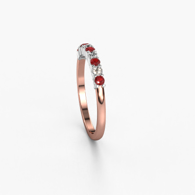 This extraordinary ring is called Yasmin 9. This type of ring is known as a memoire ring, because its gemstones are set in a continuous line. This makes it easy to combine with other rings. The band of this 14 Carat rose gold ring is set in a combination of ruby and diamond 2.4 mm. You can easily choose the combination you prefer online. As you can see, a single ruby is set in this single alliance rose gold ring. The memoire ring represents collaboration. And that is precisely what these gemstones do, collaborate. Together they add a beautiful effect to the band of a classic ring! Such a meaningful ring, wouldn't you agree? All of our hand selected ruby are positioned by hand by our expert goldsmith. It's a precise task, which can only be completed successfully through the combination of pure craftsmanship and usage of the latest techniques which give it an optimal effect. To create a perfect reflection of light, all the gemstones have to be perfectly aligned in the same way. During manufacturing, the expert goldsmith will therefore monitor the reflection of light constantly to check whether the ruby are aligned properly. This requires a skilled hand and a lot of patience but then the end product will be a true piece of art. And that is our mission!By using a combination of the latest modern techniques, combined with ancient crafting, we can make all our rings in our own studio. Each jewel is made to order. This is advantageous because we can offer you a price you won't find anywhere else.Our team of talented, passionate designers add new ring designs to our online collection daily. Our objective in doing so, is to be able to offer you a wide variety of jewels. Please feel free to request a quote if you have specific wishes for your ring. We guarantee to make you an offer you can't refuse.To make it easier for you, we offer a 30 day return policy. Check our terms and conditions.