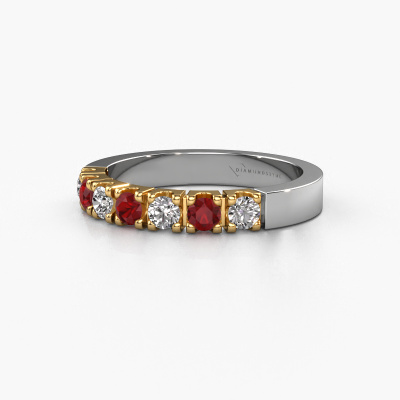 This extraordinary ring is called Dana 7. This type of ring is known as a memoire ring, because its gemstones are set in a continuous line. This makes it easy to combine with other rings. The band of this 14 Carat white gold ring is set in a combination of ruby and lab-grown diamond 3 mm. You can easily choose the combination you prefer online. As you can see, a single ruby is set in this single alliance white gold ring. The memoire ring represents collaboration. And that is precisely what these gemstones do, collaborate. Together they add a beautiful effect to the band of a modern ring! Such a meaningful ring, wouldn't you agree? All of our hand selected ruby are positioned by hand by our expert goldsmith. It's a precise task, which can only be completed successfully through the combination of pure craftsmanship and usage of the latest techniques which give it an optimal effect. To create a perfect reflection of light, all the gemstones have to be perfectly aligned in the same way. During manufacturing, the expert goldsmith will therefore monitor the reflection of light constantly to check whether the ruby are aligned properly. This requires a skilled hand and a lot of patience but then the end product will be a true piece of art. And that is our mission!After receiving your order, our goldsmiths will passionately start the creative process of making your ring in our own studio. Because we don't have a big stockpile, these costs will not be passed on to you. Our pricing is proof of that! We offer top quality jewels at lowest price, guaranteed.Our team of talented, passionate designers add new ring designs to our online collection daily. Our objective in doing so, is to be able to offer you a wide variety of jewels. Please feel free to request a quote if you have specific wishes for your ring. We guarantee to make you an offer you can't refuse.To make it easier for you, we offer a 30 day return policy. Check our terms and conditions.