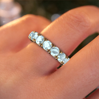 This Estee 4.2 ring in 14 Carat gold is set with aquamarine. This gold stacked Estee 4.2 ring is the perfect addition to your ring collection! As the name suggests, it is a ring which can be combined on one finger with another ring. It gives you the opportunity to create your own style. A stacked ring usually represents a certain memory of someone special or a memorable moment. It is common to combine a stacked ring, representing an anniversary, with a wedding ring. But this eternity ring, combined with your other rings, also makes a classy fashion item. The eternity Estee 4.2 ring, as shown here, can be customized to your liking. Our online tool offers many different options but please feel free to contact us if you want changes made to your Estee 4.2 ring, which are unavailable in our online tool.After receiving your order, our goldsmiths will passionately start the creative process of making your ring in our own studio. Because we don't have a big stockpile, these costs will not be passed on to you. Our pricing is proof of that! We offer top quality jewels at lowest price, guaranteed.To make it easier for you, we offer a 30 day return policy. Check our terms and conditions.