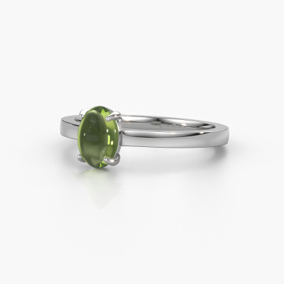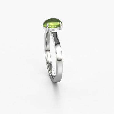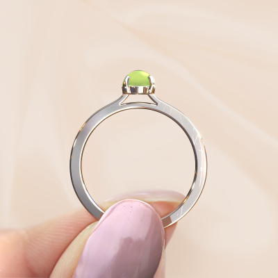 In this photo the platinum Mallie 1 ring is set with a cabochon peridot. Cabochon means a peridot is shaped first, not faceted, into a specific shape, such as a drop, heart or oval cabochon. Subsequently, it is polished until the gemstone has a orb shaped surface. A cabochon gemstone is a stunning, classy eye-catcher that matches perfectly with a contemporary as well as a vintage style. Our expert goldsmiths shape the tasteful ring to perfection which makes it unique. The cabochon peridot is set so its unique qualities are strengthened. As soon as you finished designing your Mallie 1 ring with our online tool, our goldsmiths will start their creative process of making your ring. This will be done with passion and care, according ancient crafting. On top of that, our jewels are made of eco-friendly materials. Simply customize online with our online tool, if you want any changes made. If you want specific changes made to your Mallie 1 ring, that are unavailable in our online tool, please feel free to contact our expert designers.After receiving your order, our goldsmiths will passionately start the creative process of making your ring in our own studio. Because we don't have a big stockpile, these costs will not be passed on to you. Our pricing is proof of that! We offer top quality jewels at lowest price, guaranteed.To make it easier for you, we offer a 30 day return policy. Check our terms and conditions.