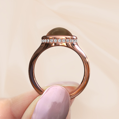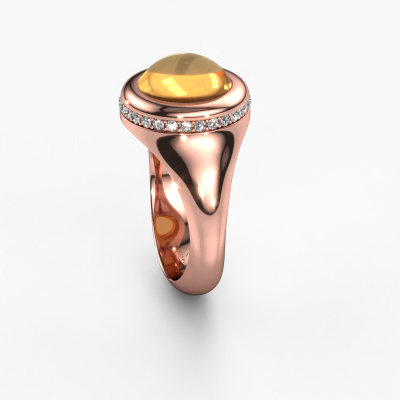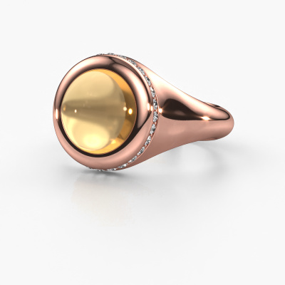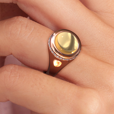 In this photo the rose gold Lesli RND ring is set with a cabochon citrin. Cabochon means a citrin is shaped first, not faceted, into a specific shape, such as a drop, heart or round cabochon. Subsequently, it is polished until the gemstone has a orb shaped surface. A cabochon gemstone is a stunning, classy eye-catcher that matches perfectly with a contemporary as well as a vintage style. Our expert goldsmiths shape the beautiful ring to perfection which makes it unique. The cabochon citrin is set so its unique qualities are strengthened. The best part of this beautiful ring is that you can customize it to your own liking. Your style, your choice, your ring. On top of that, your modern rose gold ring will be made by hand with eco-friendly materials! Please feel free to easily customize the ring, using our online tool.After receiving your order, our goldsmiths will passionately start the creative process of making your ring in our own studio. Because we don't have a big stockpile, these costs will not be passed on to you. Our pricing is proof of that! We offer top quality jewels at lowest price, guaranteed.To make it easier for you, we offer a 30 day return policy. Check our terms and conditions.
