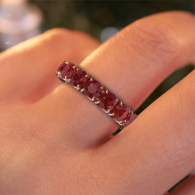 This Estee 4.2 ring in 14 Carat rose gold is set with ruby. This rose gold stacked Estee 4.2 ring is the perfect addition to your ring collection! As the name suggests, it is a ring which can be combined on one finger with another ring. It gives you the opportunity to create your own style. A stacked ring usually represents a certain memory of someone special or a memorable moment. It is common to combine a stacked ring, representing an anniversary, with a wedding ring. But this eternity ring, combined with your other rings, also makes a classy fashion item. The eternity Estee 4.2 ring, as shown here, can be customized to your liking. Our online tool offers many different options but please feel free to contact us if you want changes made to your Estee 4.2 ring, which are unavailable in our online tool.After receiving your order, our goldsmiths will passionately start the creative process of making your ring in our own studio. Because we don't have a big stockpile, these costs will not be passed on to you. Our pricing is proof of that! We offer top quality jewels at lowest price, guaranteed.To make it easier for you, we offer a 30 day return policy. Check our terms and conditions.