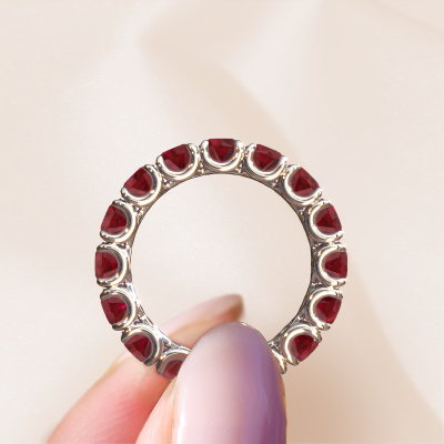 This Estee 4.2 ring in 14 Carat white gold is set with ruby. This white gold stacked Estee 4.2 ring is the perfect addition to your ring collection! As the name suggests, it is a ring which can be combined on one finger with another ring. It gives you the opportunity to create your own style. A stacked ring usually represents a certain memory of someone special or a memorable moment. It is common to combine a stacked ring, representing an anniversary, with a wedding ring. But this eternity ring, combined with your other rings, also makes a classy fashion item. The eternity Estee 4.2 ring, as shown here, can be customized to your liking. Our online tool offers many different options but please feel free to contact us if you want changes made to your Estee 4.2 ring, which are unavailable in our online tool.After receiving your order, our goldsmiths will passionately start the creative process of making your ring in our own studio. Because we don't have a big stockpile, these costs will not be passed on to you. Our pricing is proof of that! We offer top quality jewels at lowest price, guaranteed.To make it easier for you, we offer a 30 day return policy. Check our terms and conditions.