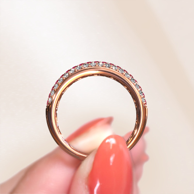 This Emely 4 ring in 14 Carat rose gold is set with ruby. This rose gold stacked Emely 4 ring is the perfect addition to your ring collection! As the name suggests, it is a ring which can be combined on one finger with another ring. It gives you the opportunity to create your own style. A stacked ring usually represents a certain memory of someone special or a memorable moment. It is common to combine a stacked ring, representing an anniversary, with a wedding ring. But this narrow ring, combined with your other rings, also makes a classy fashion item. As soon as you finished designing your Emely 4 ring with our online tool, our goldsmiths will start their creative process of making your ring. This will be done with passion and care, according ancient crafting. On top of that, our jewels are made of eco-friendly materials. Simply customize online with our online tool, if you want any changes made. If you want specific changes made to your Emely 4 ring, that are unavailable in our online tool, please feel free to contact our expert designers.By using a combination of the latest modern techniques, combined with ancient crafting, we can make all our rings in our own studio. Each jewel is made to order. This is advantageous because we can offer you a price you won't find anywhere else.To make it easier for you, we offer a 30 day return policy. Check our terms and conditions.