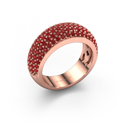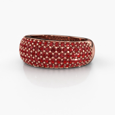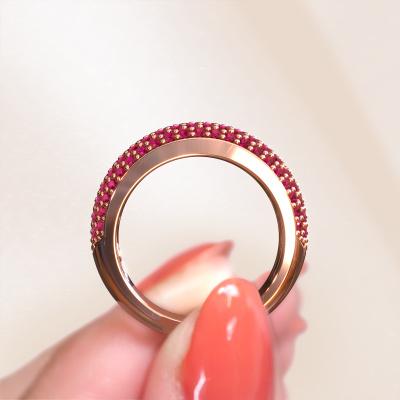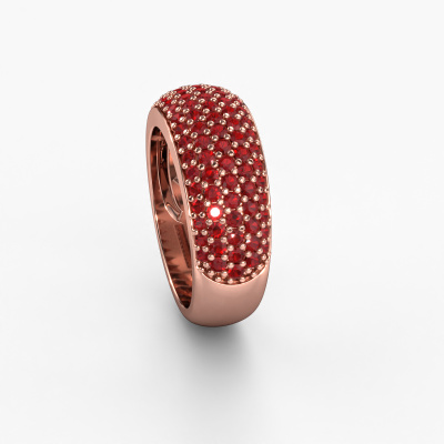 This pave set ring is called Cristy. This 14 Carat rose gold ring is set with ruby 1.2 mm. The band of this rose gold ring is set with rows of ruby which seem to have no beginning nor end. Our goldsmith carefully selects the gemstones and sets them with the utmost precision. For maximum shine, the ruby have to align perfectly. While artfully crafting and polishing the jewelry, light fall is constantly monitored, until the expert goldsmith is satisfied with the result. Designed by you, created especially for you!As soon as you finished designing your Cristy ring with our online tool, our goldsmiths will start their creative process of making your ring. This will be done with passion and care, according ancient crafting. On top of that, our jewels are made of eco-friendly materials. Simply customize online with our online tool, if you want any changes made. If you want specific changes made to your Cristy ring, that are unavailable in our online tool, please feel free to contact our expert designers.Because we design and deliver our own rings, we can offer you a ring at a price you won't find anywhere else. A ring is made to order, which helps prevent excess supplies, so we can make you a great price offer. We understand it feels risky, buying your ring online, but we will gladly assist in the designing process, taking your budget into consideration.To make it easier for you, we offer a 30 day return policy. Check our terms and conditions.