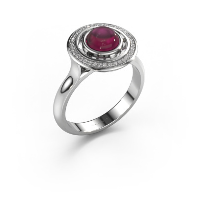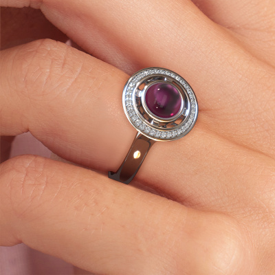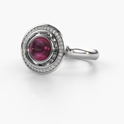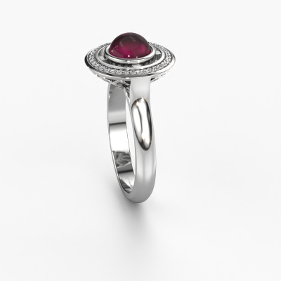In this photo the platinum Salima ring is set with a cabochon rhodolite. Cabochon means a rhodolite is shaped first, not faceted, into a specific shape, such as a drop, heart or round cabochon. Subsequently, it is polished until the gemstone has a orb shaped surface. A cabochon gemstone is a stunning, classy eye-catcher that matches perfectly with a contemporary as well as a vintage style. Our expert goldsmiths shape the special ring to perfection which makes it unique. The cabochon rhodolite is set so its unique qualities are strengthened. How do you like this design platinum ring? Simply customize this Salima ring, using our online tool. Subsequently, your personal special Salima ring will be made by hand by our goldsmiths. Precious metals and gemstones can be customized to your liking. Do you have specific preferences which are unavailable in our online tool? Please feel free to contact us. We will customize your personal design ring to your liking.After receiving your order, our goldsmiths will passionately start the creative process of making your ring in our own studio. Because we don't have a big stockpile, these costs will not be passed on to you. Our pricing is proof of that! We offer top quality jewels at lowest price, guaranteed.To make it easier for you, we offer a 30 day return policy. Check our terms and conditions.