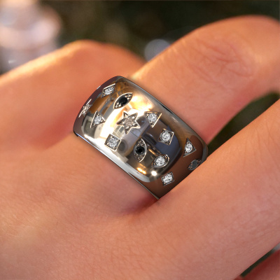 How would you describe your own style? Are you looking for something uniquely different? This wide platinum Sasha 2 ring is astonishing! Simply customize to your or her own liking. This ring is set with black diamond. These black diamonds have been carefully selected because your ring must be adorned with nothing but the most beautiful gemstone. Wouldn't you agree? Our expert goldsmith will create your ring in our own crafting studios, where the black diamond will be set with care. The ring will then be polished to perfection to give it that extra sparkle. It's a perfect ring for a woman of excellent taste!As soon as you finished designing your Sasha 2 ring with our online tool, our goldsmiths will start their creative process of making your ring. This will be done with passion and care, according ancient crafting. On top of that, our jewels are made of eco-friendly materials. Simply customize online with our online tool, if you want any changes made. If you want specific changes made to your Sasha 2 ring, that are unavailable in our online tool, please feel free to contact our expert designers.After receiving your order, our goldsmiths will passionately start the creative process of making your ring in our own studio. Because we don't have a big stockpile, these costs will not be passed on to you. Our pricing is proof of that! We offer top quality jewels at lowest price, guaranteed.To make it easier for you, we offer a 30 day return policy. Check our terms and conditions.