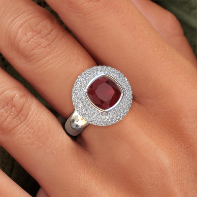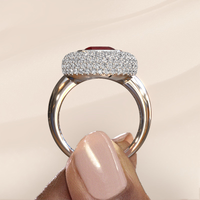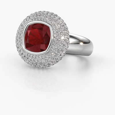 This exclusive platinum Keshia ring is a true work of art! This ring is made of platinum and is set with 8 mm cushion ruby. The smallest ornaments are crafted by our goldsmith with a lot of patience and great passion. In order to create this ring with great precision, this craft requires a keen eye and a skillful hand. A challenge which ignites a fire in our expert goldsmiths. The exquisite ruby are set in a way that their unique qualities are strengthened. This gives the ring an even more glamorous appearance. The ring is unique by itself though, because of the natural birthstones we selected especially for this Keshia ring. And by choosing the precious metal yourself, you create a unique ring. Our goldsmiths passionately create your customized ring to your liking with the utmost care. The platinum ring, as shown here, can be customized using our online tool. Feel free to ask our jewel designers for assistance if you want changes made which are unavailable in our online tool. We are happy to answer your questions.By using our modern techniques, we can design and customize the finest quality jewels with the utmost care for you. Our rings are always priced 30 percent lower than other jewelers. We make rings to order, so we don't have to maintain a large stock. If you have a certain budget, we are more than happy to advice you accordingly.To make it easier for you, we offer a 30 day return policy. Check our terms and conditions.