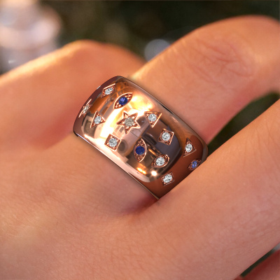 How would you describe your own style? Are you looking for something uniquely different? This wide rose gold Sasha 2 ring is astonishing! Simply customize to your or her own liking. This ring is set with sapphire. These sapphire have been carefully selected because your ring must be adorned with nothing but the most beautiful gemstone. Wouldn't you agree? Our expert goldsmith will create your ring in our own crafting studios, where the sapphire will be set with care. The ring will then be polished to perfection to give it that extra sparkle. It's a perfect ring for a woman of excellent taste!As soon as you finished designing your Sasha 2 ring with our online tool, our goldsmiths will start their creative process of making your ring. This will be done with passion and care, according ancient crafting. On top of that, our jewels are made of eco-friendly materials. Simply customize online with our online tool, if you want any changes made. If you want specific changes made to your Sasha 2 ring, that are unavailable in our online tool, please feel free to contact our expert designers.After receiving your order, our goldsmiths will passionately start the creative process of making your ring in our own studio. Because we don't have a big stockpile, these costs will not be passed on to you. Our pricing is proof of that! We offer top quality jewels at lowest price, guaranteed.To make it easier for you, we offer a 30 day return policy. Check our terms and conditions.