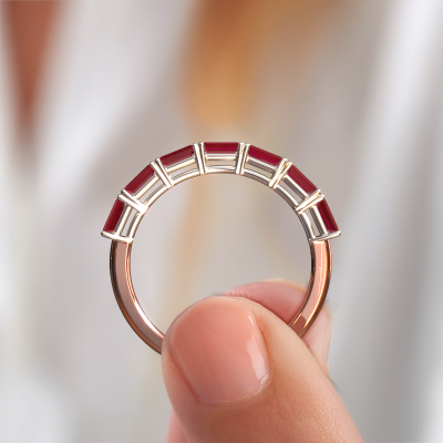 This exclusive rose gold Vivienne half EME ring is a true work of art! This ring is made of 14 Carat rose gold and is set with 4x2 mm emerald cut ruby. The smallest ornaments are crafted by our goldsmith with a lot of patience and great passion. In order to create this ring with great precision, this craft requires a keen eye and a skillful hand. A challenge which ignites a fire in our expert goldsmiths. The exquisite ruby are set in a way that their unique qualities are strengthened. This gives the ring an even more glamorous appearance. The ring is unique by itself though, because of the natural birthstones we selected especially for this Vivienne half EME ring. And by choosing the precious metal yourself, you create a unique ring. As soon as you finished designing your Vivienne half EME ring with our online tool, our goldsmiths will start their creative process of making your ring. This will be done with passion and care, according ancient crafting. On top of that, our jewels are made of eco-friendly materials. Simply customize online with our online tool, if you want any changes made. If you want specific changes made to your Vivienne half EME ring, that are unavailable in our online tool, please feel free to contact our expert designers.After receiving your order, our goldsmiths will passionately start the creative process of making your ring in our own studio. Because we don't have a big stockpile, these costs will not be passed on to you. Our pricing is proof of that! We offer top quality jewels at lowest price, guaranteed.To make it easier for you, we offer a 30 day return policy. Check our terms and conditions.