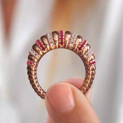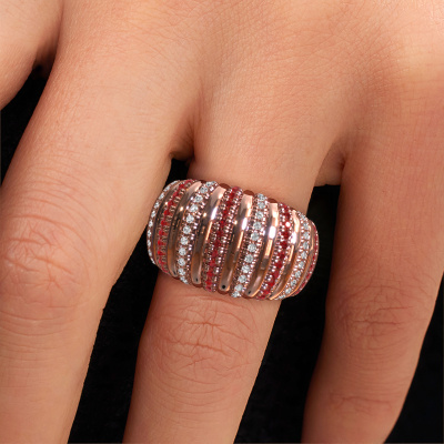 Because of its detailed finish, this wide ring with ruby has a stylish appearance. A elegant ring that fits the contemporary woman like a glove. This rose gold ring, our Dawn 14 mm, is a true eye-catcher indeed! As soon as we know what you desire, we will create your ring in our own crafting studio. We work according an innovative process. We use a combination of the latest techniques and ancient traditional craftsmanship, so we are able to create a perfectly designed ring. Our expert goldsmiths strive for perfection so they won't stop until a perfect ring, a true work of art, is created especially for you!Customize your own elegantDawn 14 mm ring, which will then be created by our goldsmiths with great passion. Do you prefer a different option than is shown here in the rose gold Dawn 14 mm ring? Then our online tools offers various options. Feel free to ask us for help if you are unable to succeed. We are happy to answer your questions!After receiving your order, our goldsmiths will passionately start the creative process of making your ring in our own studio. Because we don't have a big stockpile, these costs will not be passed on to you. Our pricing is proof of that! We offer top quality jewels at lowest price, guaranteed.To make it easier for you, we offer a 30 day return policy. Check our terms and conditions.