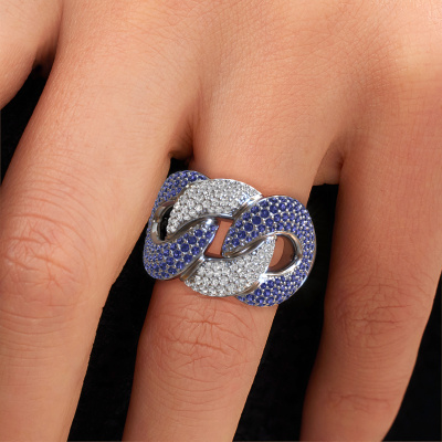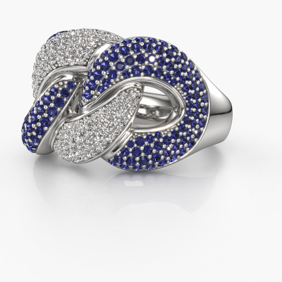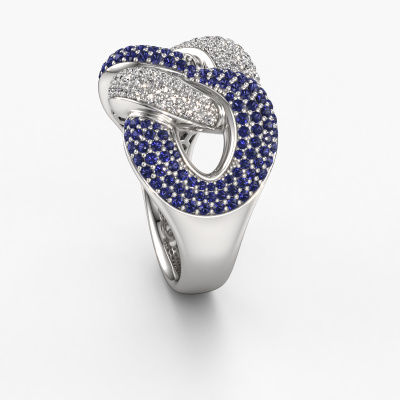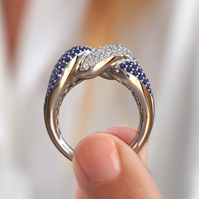 This pave set ring is called Kylie 3 15mm. This platinum ring is set with sapphire 0.8 mm. The band of this platinum ring is set with rows of sapphire which seem to have no beginning nor end. Our goldsmith carefully selects the gemstones and sets