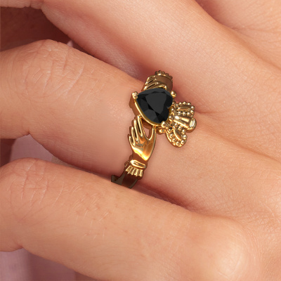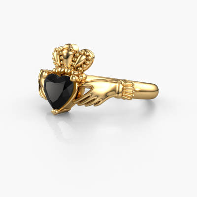 This Irish Claddagh ring is a sign of love set with a heart black diamond. It is a remarkable, symbolic ring in which a crowned heart, held by two hands, is shown. The heart of a Claddagh ring is a symbol of love, the hands represent friendship and the crown, loyalty. A beautiful piece of jewelry to either give or receive! This symbolic 14 Carat gold Claddagh 2 ring is made by hand in our own studio by our expert goldsmiths. The symbolic Claddagh 2 ring, as shown here, can be customized to your liking. Our online tool offers many different options but please feel free to contact us if you want changes made to your Claddagh 2 ring, which are unavailable in our online tool.After receiving your order, our goldsmiths will start the creative process of making your Claddagh 2 ring. We don't keep stock. This is advantageous because these costs will not be passed on to you. Therefore, we can offer jewelry at exceptionally low prices.To make it easier for you, we offer a 30 day return policy. Check our terms and conditions.
