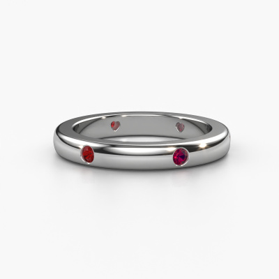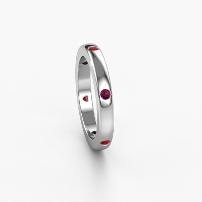 This Charla stackable ring in platinum is set with ruby. This platinum stacked Charla ring is the perfect addition to your ring collection! As the name suggests, it is a ring which can be combined on one finger with another ring. It gives you the opportunity to create your own style. A stacked ring usually represents a certain memory of someone special or a memorable moment. It is common to combine a stacked ring, representing an anniversary, with a wedding ring. But this symbolic ring, combined with your other rings, also makes a classy fashion item. The best part of this symbolic stackable ring is that you can customize it to your own liking. Your style, your choice, your stackable ring. On top of that, your trendy platinum stackable ring will be made by hand with eco-friendly materials! Please feel free to easily customize the ring, using our online tool.By using a combination of the latest modern techniques, combined with ancient crafting, we can make all our rings in our own studio. Each jewel is made to order. This is advantageous because we can offer you a price you won't find anywhere else.To make it easier for you, we offer a 30 day return policy. Check our terms and conditions.