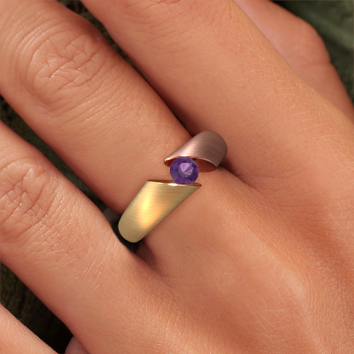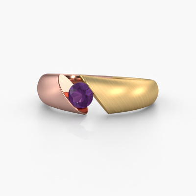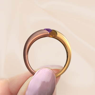 This ring called Hojalien 1 is made of 14 Carat rose gold and is set with amethyst. Are you in the market for a unique rose gold ring with a modern twist? Then this ring might suit you. Simply customize to your or her liking. It suits the contemporary modern woman. This tasteful ring is set with beautiful amethyst. This has been carefully selected. Because your ring must be adorned with nothing but the most stunning gemstone. Our expert goldsmith will create your ring in our own studio, where the amethyst will be set with great care. The ring will then be polished to perfection to create a stunning ring. By using our modern techniques, we can design and customize the finest quality jewels with the utmost care for you. Our rings are always priced 30 percent lower than other jewelers. We make rings to order, so we don't have to maintain a large stock. If you have a certain budget, we are more than happy to advice you accordingly.