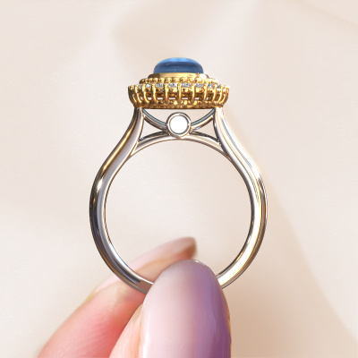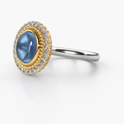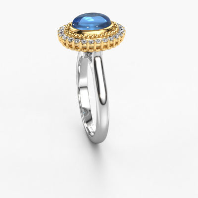 The ring shown above is called the Maartje. We call this type of ring a cluster ring, the center gemstone is surrounded by smaller sized stones. This 14 Carat white gold version is set with a 8x6 mm oval cabochon blue topaz center stone, embraced by smaller diamonds. If you look at this white gold cluster ring, you might get the impression that its smaller sized stones collide with the bigger blue topaz, so it is shaped like a flower. Therefore this ring is also known as the flower ring. Our artisan Goldsmiths get the job done. Each individual stone is carefully set by hand. During manufacturing, light fall is constantly monitored to make sure the special cluster effect is still visible. In the end you get the perfect ring with a radiant blue topaz gemstone centerpiece. You can imagine the effect of a ring of such significance when you give tot the love of your life on her special day to shine. After receiving your order, our goldsmiths will passionately start the creative process of making your ring in our own studio. Because we don't have a big stockpile, these costs will not be passed on to you. Our pricing is proof of that! We offer top quality jewels at lowest price, guaranteed.Our team of talented, passionate designers add new ring designs to our online collection daily. Our objective in doing so, is to be able to offer you a wide variety of jewels. Please feel free to request a quote if you have specific wishes for your ring. We guarantee to make you an offer you can't refuse.To make it easier for you, we offer a 30 day return policy. Check our terms and conditions.