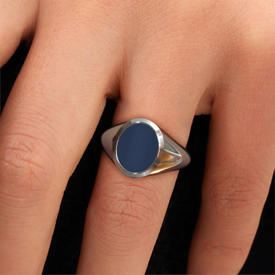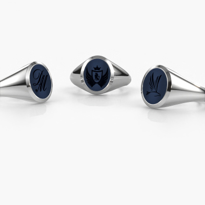 This white gold women´s signet ring is a true work of art! This is our elegant Evon 2 signet ring and it is set with a oval shape dark blue sardonyx. In our crafting studio, we use a combination of the latest techniques and ancient traditional craftsmanship, so we are able to create a detailed perfect signet ring. Our expert goldsmiths are fascinated by signet rings. The signet ring can be engraved with initials or a family weapon. Signet rings with family weapons can be handed down from generation to generation and that usually is the case. On top of that, a signet ring is a beautiful, classy piece of jewelry which is trending once more. More than one reason to start or extend the tradition. Please browse our online database for more options on engravings. You can find the departments of our education center at the bottom of this page. The best part of this elegant signet ring is that you can customize it to your own liking. Your style, your choice, your signet ring. On top of that, your modern white gold signet ring will be made by hand with eco-friendly materials! Please feel free to easily customize the ring, using our online tool.After receiving your order, our goldsmiths will passionately start the creative process of making your ring in our own studio. Because we don't have a big stockpile, these costs will not be passed on to you. Our pricing is proof of that! We offer top quality jewels at lowest price, guaranteed.To make it easier for you, we offer a 30 day return policy. Check our terms and conditions.
